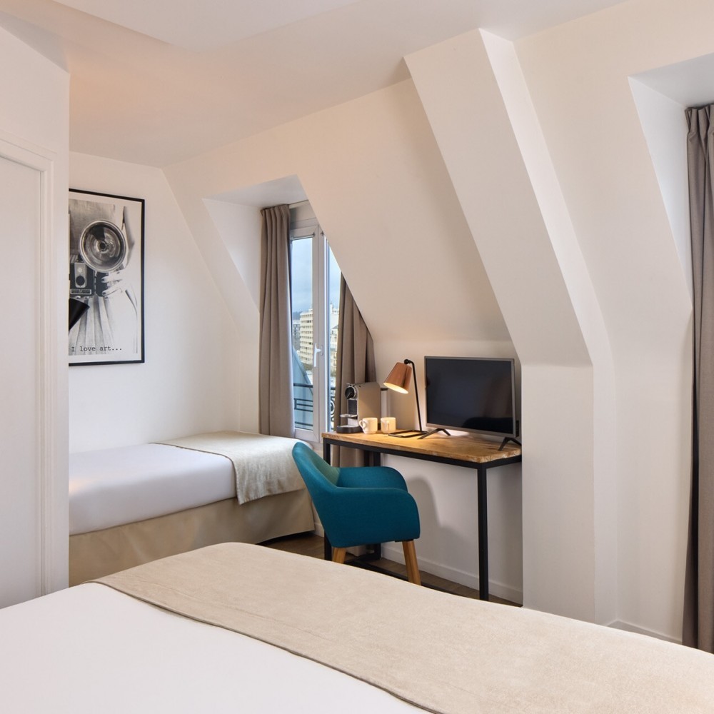 Immerse yourself in the comfort of our double room, ideal for a romantic getaway or a Parisian escape. It offers a cozy double bed and a warm atmosphere. Enjoy modern design, high-tech amenities, and an elegant bathroom for a moment of relaxation after your visits.
